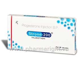 Strone-200 injection contains the active ingredient progesterone a naturally produced hormone involved in the normal menstrual cycle and in maintaining a pregnancy. Each ampoule contains 200mg progesterone per 2mL in a medium chain triglyceride oil base with benzyl alcohol as preservative. ie it is Progesterone 100mg/ml but is a 2ml vial containing 200mg