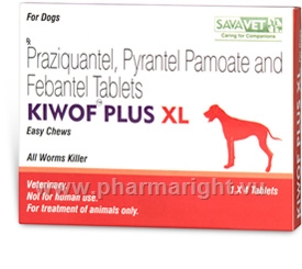 Kiwof Plus XL Easy Chew tablets 175/504/524 are used as a multi spectrum de-wormer for dogs, and are suitable for medium and large dogs, but nor for puppies or cats. Kiwof Plus XL Easy Chews are effective in the control of all common gastrointestinal worms. These include the roundworms (ascarids) Toxicara canis and Toxascaris leonine; the hookworms Ancylostoma caninum and Uncinaria stenocephala; and the whipworm Trichuris vulpis. They are also effective against intestinal tapeworms (cestodes), including Dipylidium caninum, Taenia taeniaformis, Echinococcus granulosus and Echincoccus multilocularis, and for removal and control of the hyatid cyst, which is the larval form of the tapeworm. Kiwof Plus XL Easy Chews can also be used in combination with other treatments such as medications for the prevention of heartworm, fleas and ticks; also, vaccinations, but should not be used in combination with other deworming medications. Kiwof Plus XL Easy Chews can be given directly to the dog or disguised in food and are easy to use.